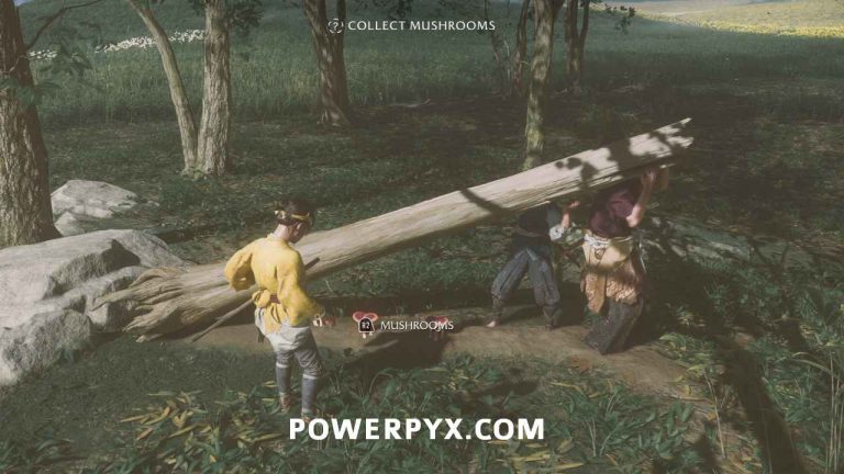 Eventually, you come to a fallen log at the edge of the forest. Lord Saito and Jubei lift the log for you to pick more mushrooms.