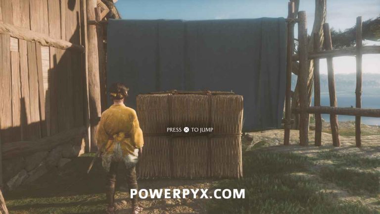 Follow Jubei to the left around the house to a large hay bale next to a wall. Use to climb the bale and then