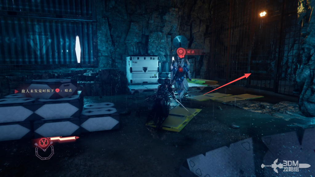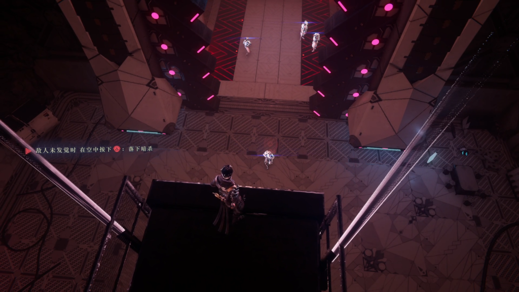 Hay un enemigo al frente que nos da la espalda. También podremos asesinar directamente, pero al mismo tiempo seremos descubiertos por el enemigo.