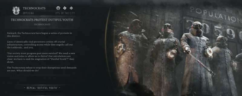 Durante esse período, as facções que você rejeitou no Capítulo 2 começarão a protestar, o que causará o fechamento de certas áreas. Você pode tentar fazer com que eles parem de protestar mudando as leis ou dando-lhes dinheiro e uma agenda, mas isso é apenas o começo da subsequente escalada de tensões que o acompanhará durante o resto do jogo.