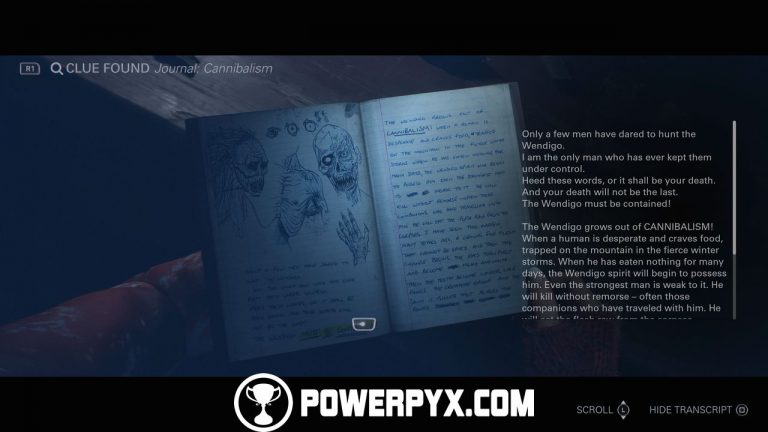 #102- #106 1952 Pista 18-22: Depois de escapar do Wendigo como Chris, você estará no porão da pousada controlando Ashley. Ela pegará automaticamente um livro do estranho. Cada página é uma pista. Deslize uma vez para a esquerda primeiro e depois deslize todas as páginas para a direita para obter todas as pistas.