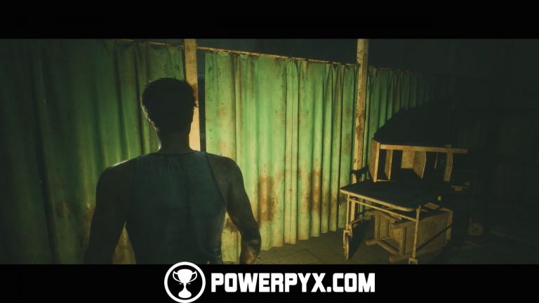 #52 1952 Pista 9 – Cadeira de restrição: Logo após o #51 você receberá um facão no decorrer da história. Logo após pegá-lo, vire à direita e siga em frente para a próxima sala. Abra a cortina do lado esquerdo para ver a cadeira de restrição.