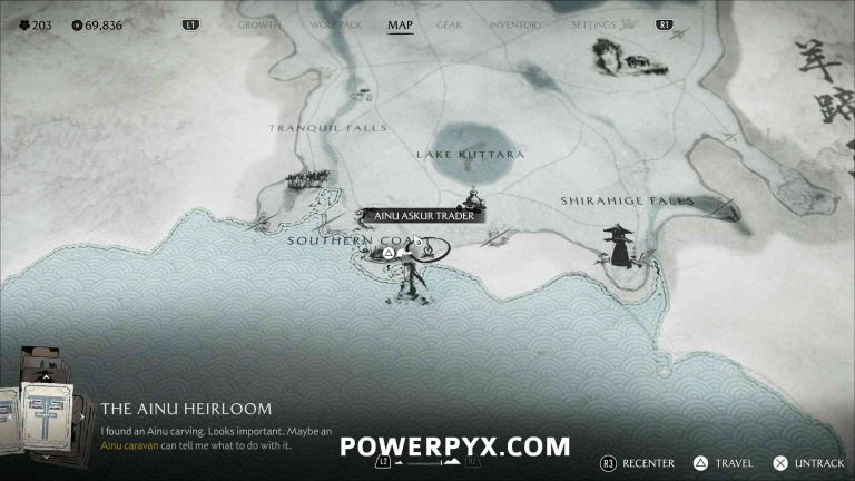 Ainu Item #1 - Somente obtido durante a história lateral: uma bebida com um estranho. Converse com o velho no local do mapa nomeado "Ainu Askur Trader". Ele então quer que você encontre seu item perdido de Ainu no final dos penhascos, onde é um pilar dos caídos. Ele o leva à borda onde você pode descer para chegar ao item, obtê -lo é o objetivo da missão, para que não possa perder.