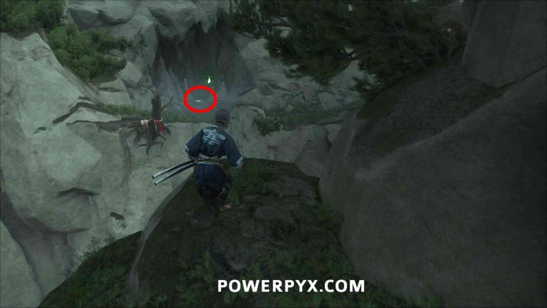 Ainu Item #18 - onde o "V" da "caverna dos olhos do javali" está no mapa, em cima de um penhasco, debaixo de uma árvore.