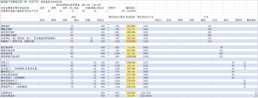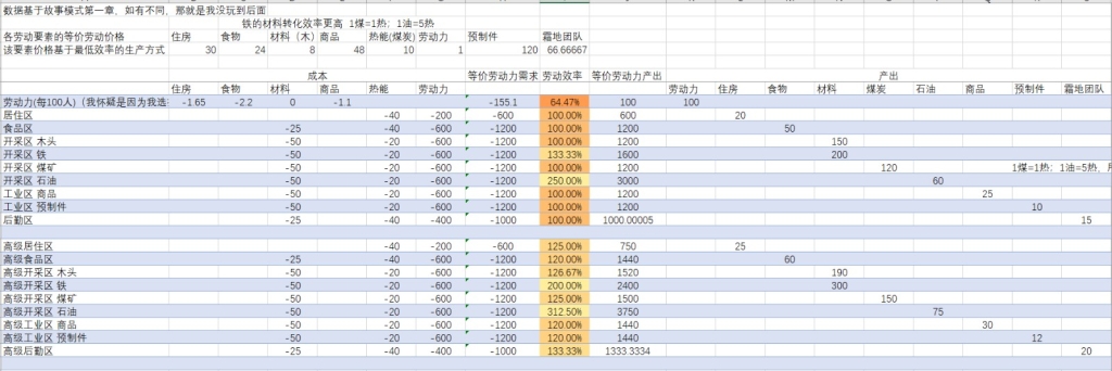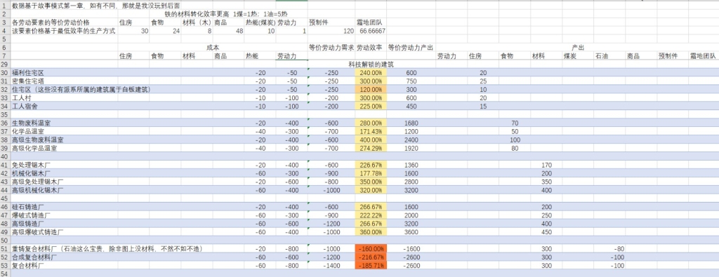 Трудно провести анализ без стандартов. Здесь я заимствую трудовую теорию стоимости из реального мира, используя эквивалентную рабочую силу каждого фактора труда в качестве посредника для измерения эффективности. Цена каждого фактора труда следующая: Жилье 30 (рабочая сила на единицу, ниже) То же, что и), Еда 24, Материал 8, Товары 48, Тепло 10, Сборные дома 120, Команда Морозных земель 66,666.