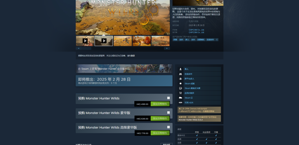 «Monster Hunter: Wildlands» — последняя игра из серии Monster Hunter. Это многопользовательская совместная охотничья игра. В основном он рассказывает историю монстров и людей, живущих в мире с двумя сторонами. Время запуска игры — 10 часов утра 28 февраля 2025 года. Время предварительной загрузки игры — за день до даты релиза, поэтому нельзя исключать возможность задержки билетов.