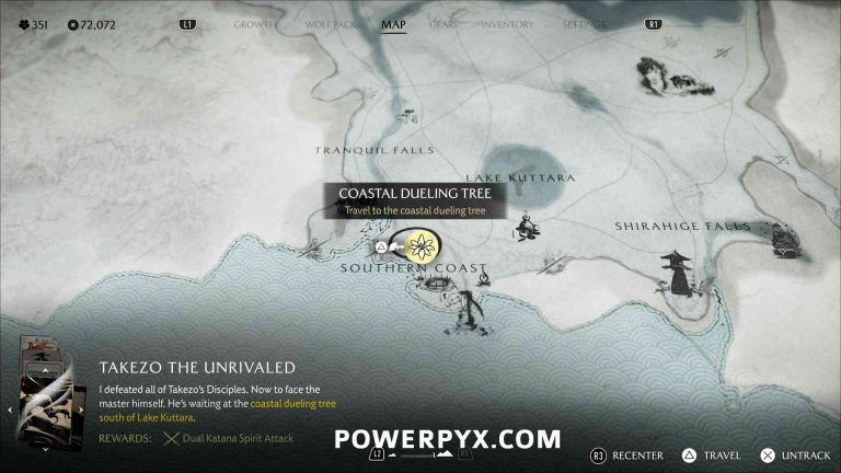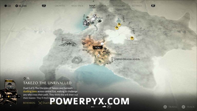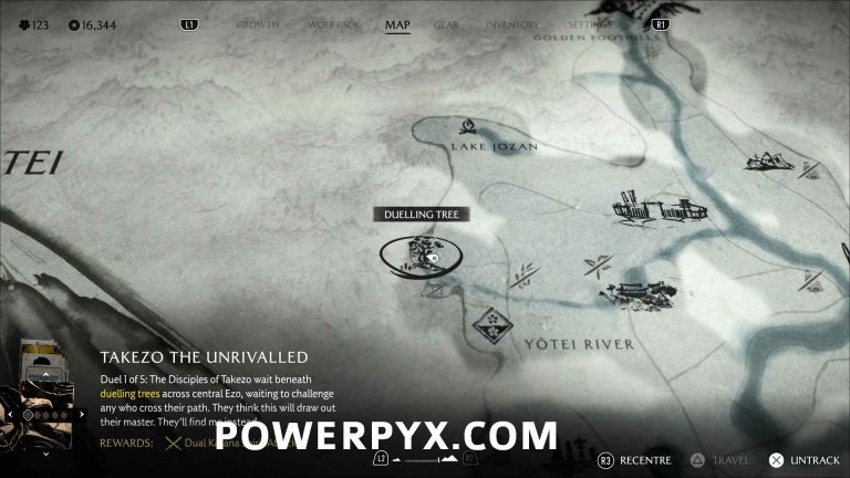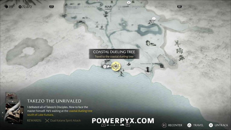 После очистки всех остальных 5 дуэльных деревьев, это будет отмечено как цель квеста на юге лугов Йотеи. Отслеживайте его с карты, чтобы ветер направлял вас там. Он находится на вершине скал и является зоной именной карты. Взаимодействуйте с пнем костра, чтобы «подождать Takezo». Затем следуйте за ним по пляжу, чтобы начать дуэль.