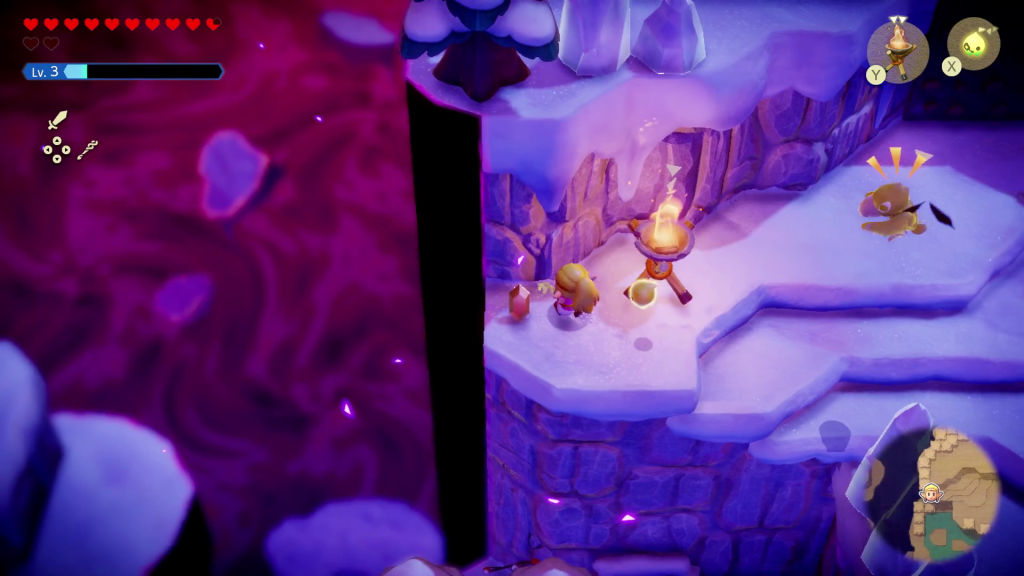 如果你向右走,再次爬下来,你会看到另一个未点燃的火把和一根火鸡。如果您还没有学过火基斯回声,请取下火基斯并学习火基斯回声。按住 Y 将火鹅放在栏杆上较远的位置,然后用 Tri 抓住它,将其压倒并点燃火把。