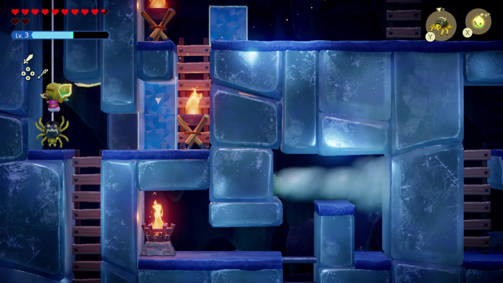 打开门并顺着梯子进入二维序列。您会注意到掉落的冰柱堵塞了这些冰孔,从而允许安全通过。快速使用 Tri 在它掉落之前抓住它,并在攀爬时用它来阻挡冰冷的空气。