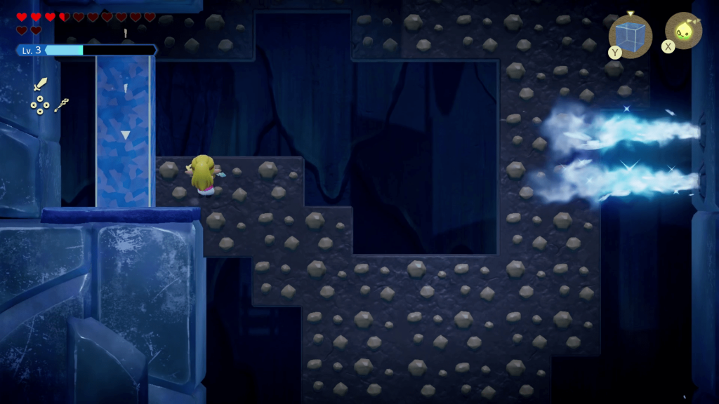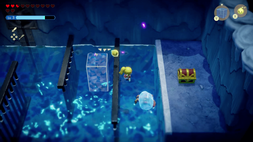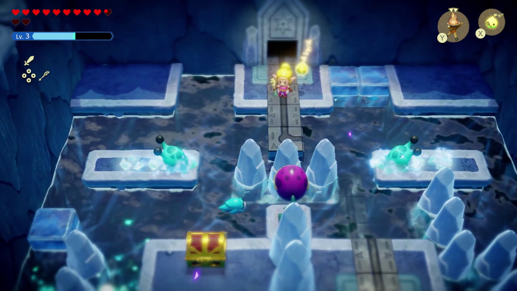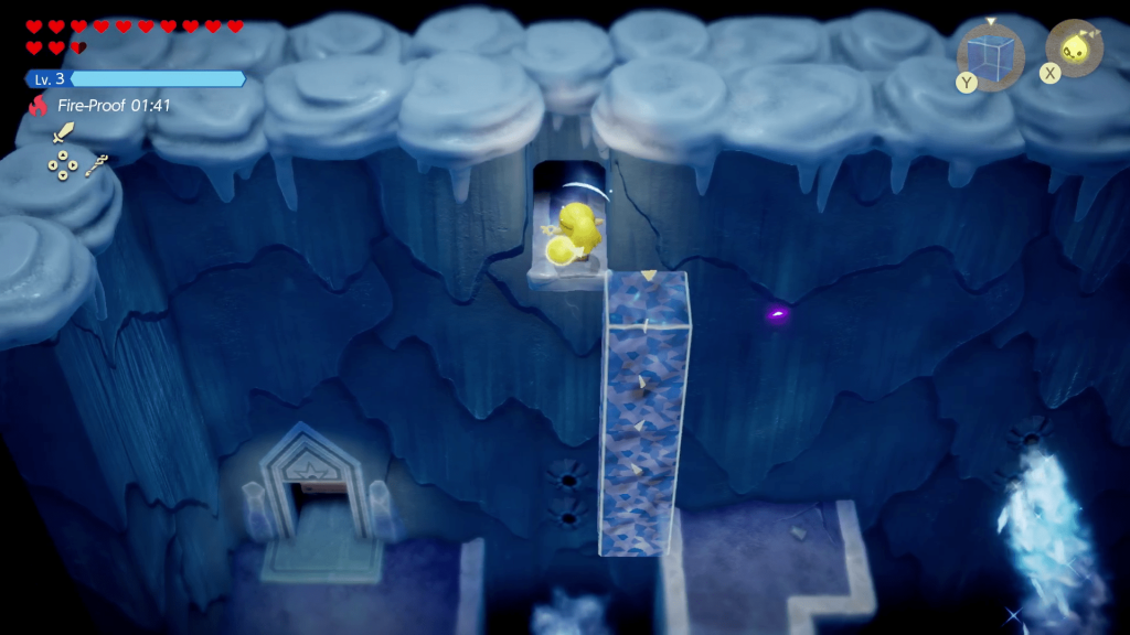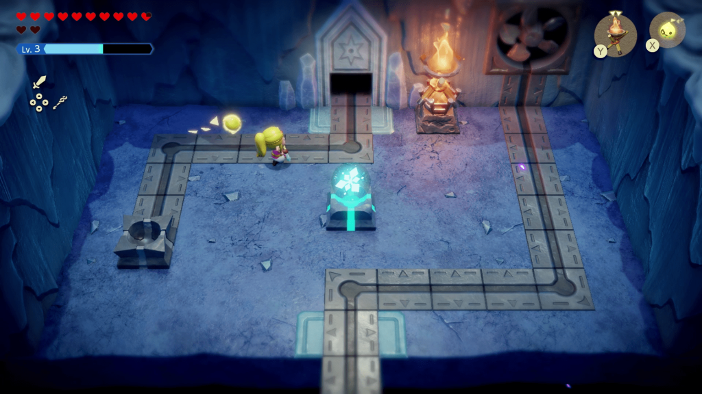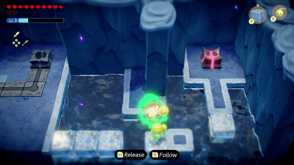 将球体放在基座上,然后返回梯子并进入左侧的房间。要激活这些开关,需要同时按下它们。为此,请将冰块推到右侧开关,并快速召唤冰块回声到左侧开关,以便它们同时击中开关。 (这可能需要尝试几次。)