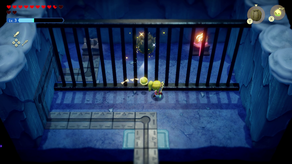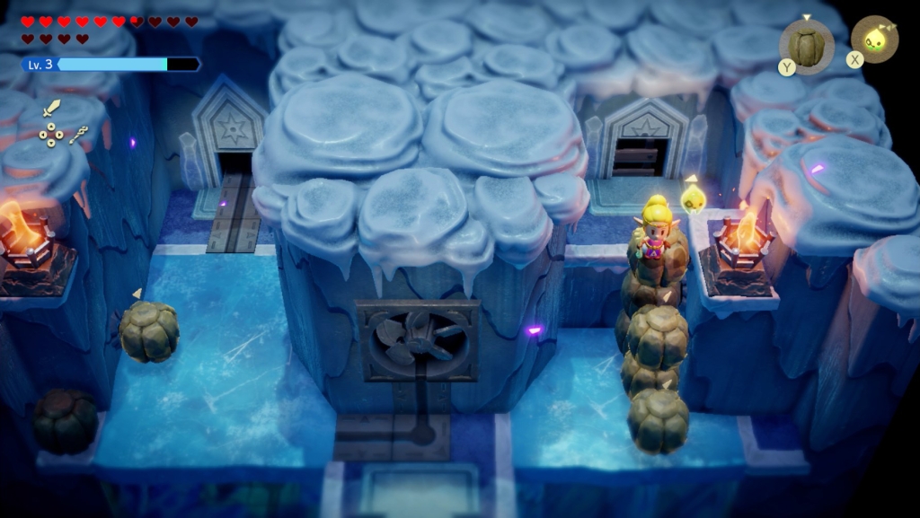 用一块巨石堵住左边的冰孔,让你进入左后方的房间。按住 Y 并用一块巨石堵住通风口,这样 Tri 就可以将其穿过栅栏。现在使用Tri拿起火球并将其放在基座上,融化之前房间中的所有冰块。