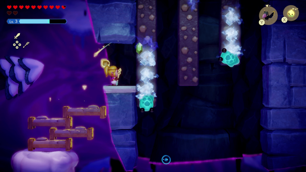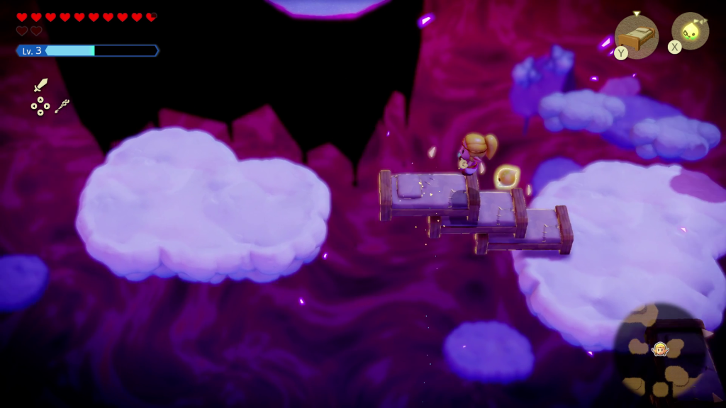 向上并向左走,干掉沿途阴暗的敌人。从附近闪闪发光的小云中学习云回声,然后小心地向左走,找到一个里面有怪物石的箱子。