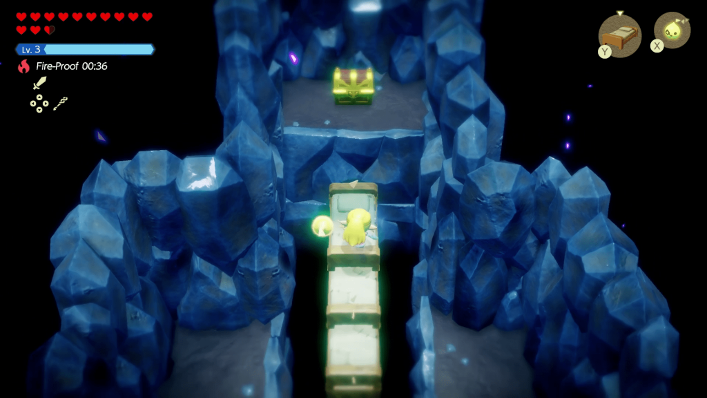 返回寺庙入口,然后进入正确的房间,第一次体验这个地牢的谜题主题。目标是将右侧的火球带到左侧的基座上。建造一座你选择的桥梁,这样你就可以穿过球体,使用 Tri 将其拾起,然后将其带回基座。