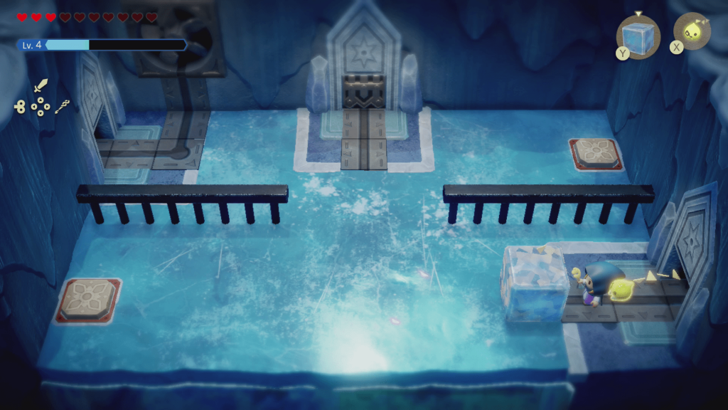 之前的房间现在会结冰,所以回到那里。在底部召唤一个冰块回响,您可以按下左侧开关,然后快速召唤一个冰块到右侧开关,以便它们同时激活。同样,由于时间紧迫,这可能需要几次尝试。我们像这样放置第一个块,然后跳过栏杆将冰放在顶部开关上: