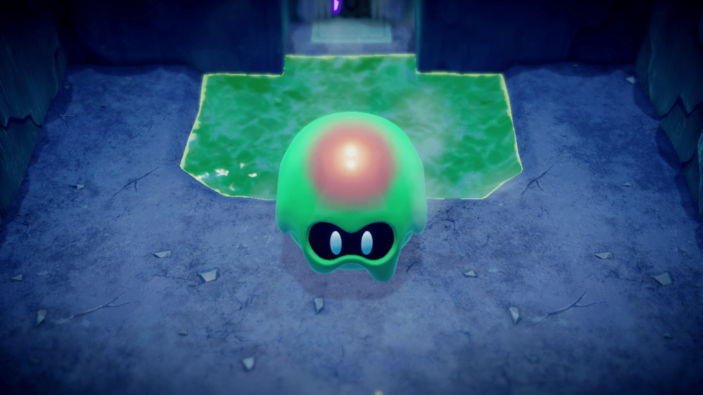 现在你将身处一个有几个敌人的房间里,还有一个箱子,里面有三个扭曲的南瓜。最后,在可到达的正常地方出现了那些冰蛞蝓敌人,还有一个可能不错的蓝色幽灵型敌人。带他们出去获得恐鸟回声和冰冻蛞蝓回声。