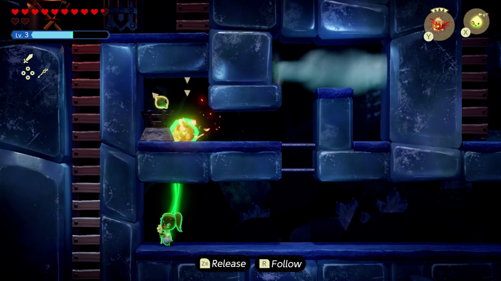 继续向上并向下走梯子。下降到平台上。下一个 2D 部分涉及大量平台,但您仍然可以使用您想要绕过的任何方法。你可以使用飞行回声滑行,拿出你漂亮的飞行瓷砖回声,使用你新获得的云,或者只是把它放在床上。我们个人使用了乌鸦飞行和飞瓦的组合。我们确实建议让飞行的敌人发出回声,以帮助你消灭那些吹风的吉罗敌人,这样你的飞行路径就不会被干扰。