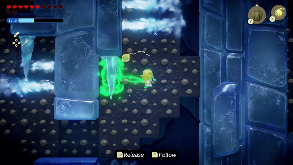 沿着梯子走下去,你会遇到另一个常见的地下城主题:用巨石堵住这些冰孔。使用“绑定”拖动巨石来堵塞通风口(或使用巨石回声召唤自己的通风口),让您可以在进入下一个房间之前通过。