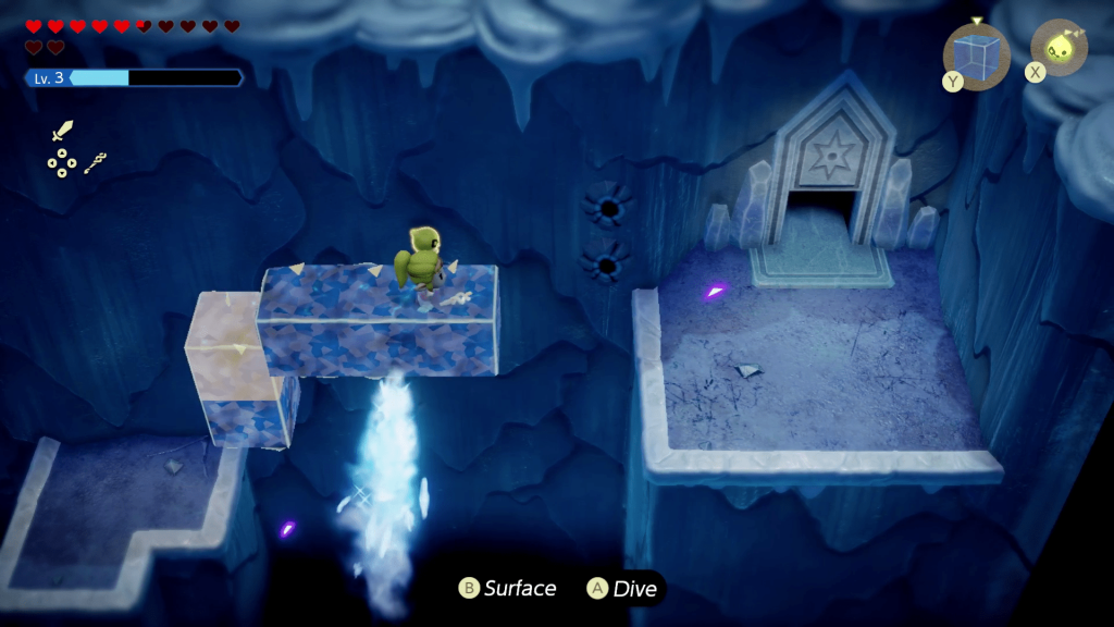 回头潜入左侧的水中捡起一把小钥匙。现在回到带有火球的房间。使用Tri捡起它并将其拖过冰孔,将其变成冰球! (学到了新机械师!)将其放在基座上以重新冻结房间。