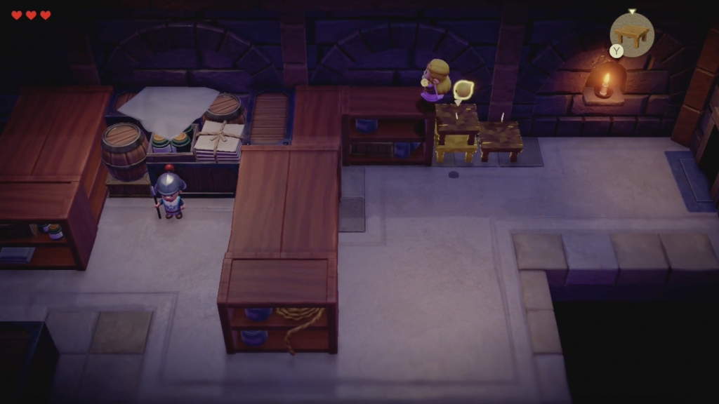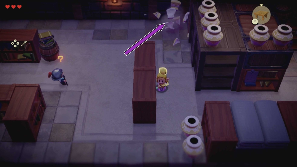 在下一个拐角处,您会看到两名警卫。一旦他们停止说话,你就可以从他们身边走过去;它们仍然面向货架。相反,爬上下面屏幕截图中的梯子,然后向左走即可获得海拉尔城堡锅回声。