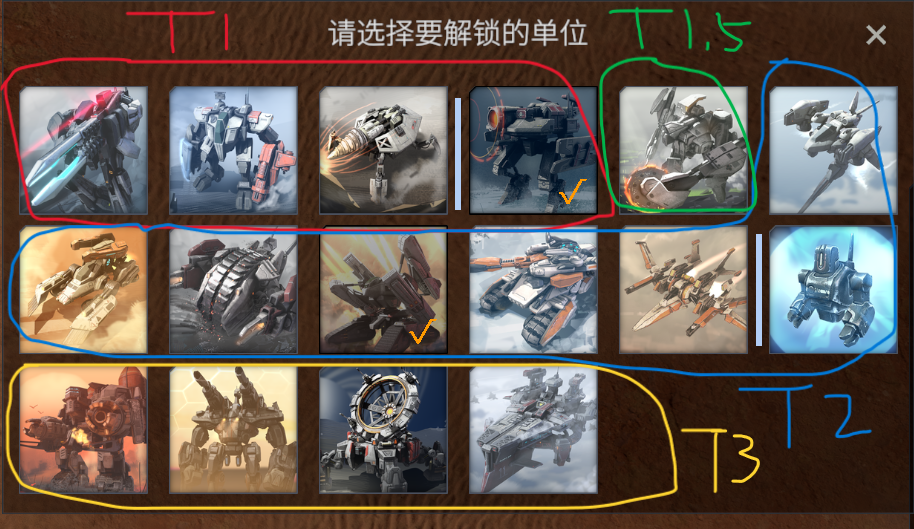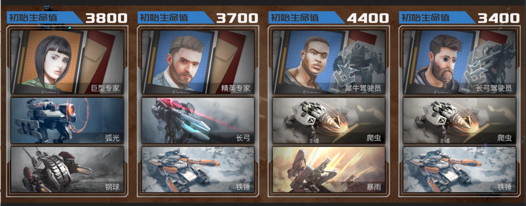 第一轮开始时,双方都有四个初始开局可供选择,但这些初始开局对双方来说都是不同的。初始启动包括一名专家、两队t2、三队t1,并解锁相应单位。 (t2指50元解锁200购买的单位,t1指0解锁费100购买的单位,t3具体指200解锁400购买的巨型单位)同时每个人的血量最初的专家是不同的。
