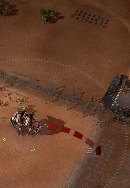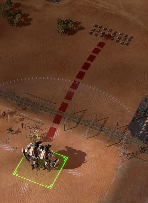 单位有两种攻击权重,一是距离,二是转身时间。单位会根据距离和回合时间计算出自己可以先击中哪个单位,这就是它的攻击目标。点击单位显示的红色箭头是该单位的攻击方向,周围的白线是其攻击范围。